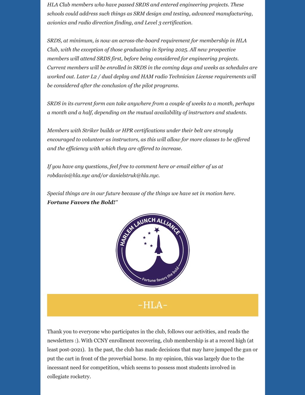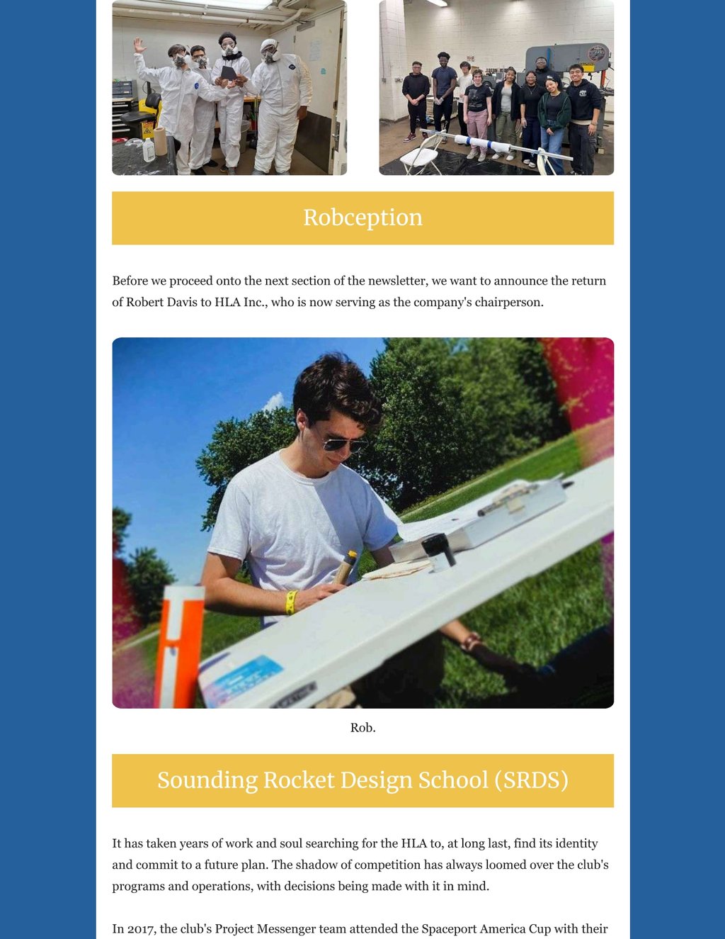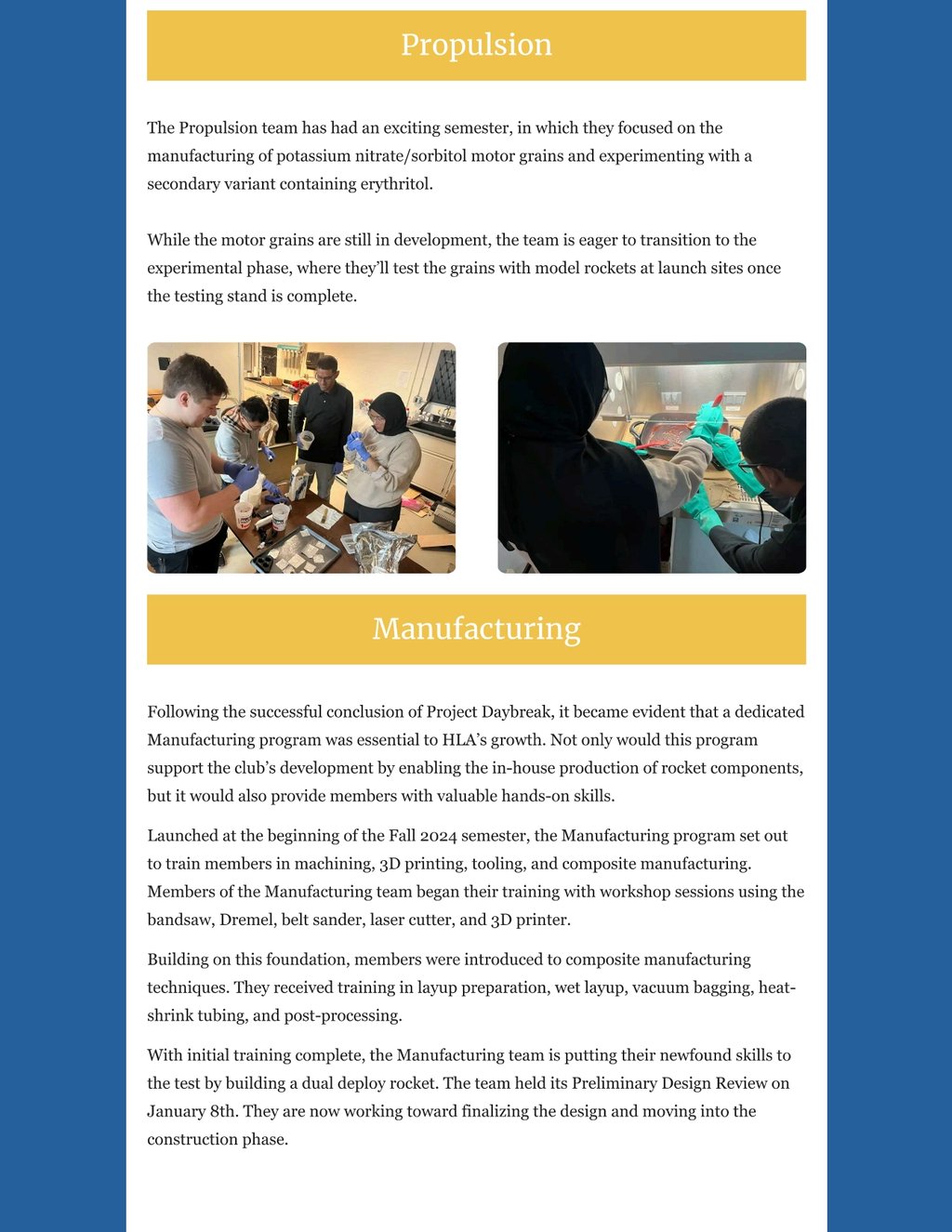 While circumstances beyond my control prevented me from pumping more newsletters out, the HLA's programs have made tremendous progress, the club found and committed to its identity, and there is so much to share. We've committed to a single path on the crossroads of collegiate rocketry, and this newletter will tell you exactly what that path is - after an update on all of out programs of course.