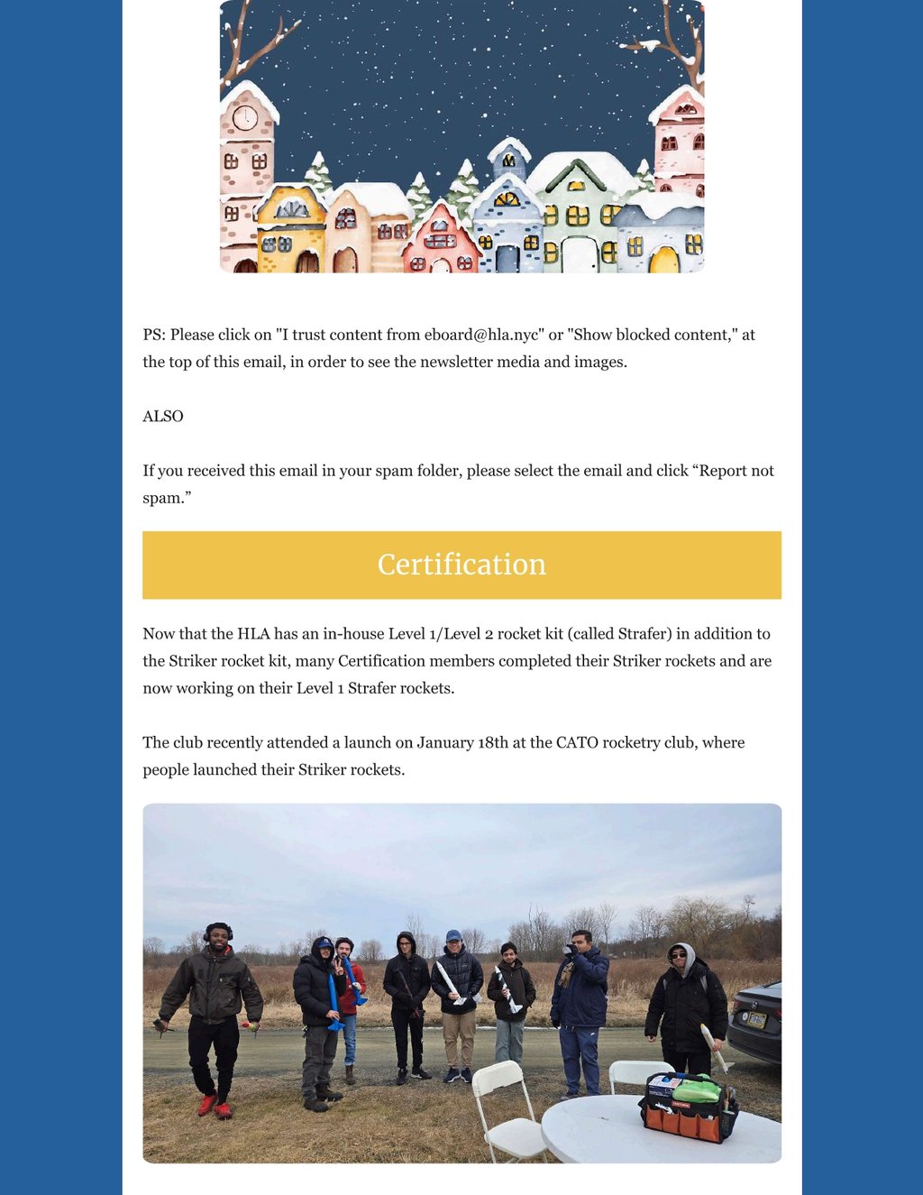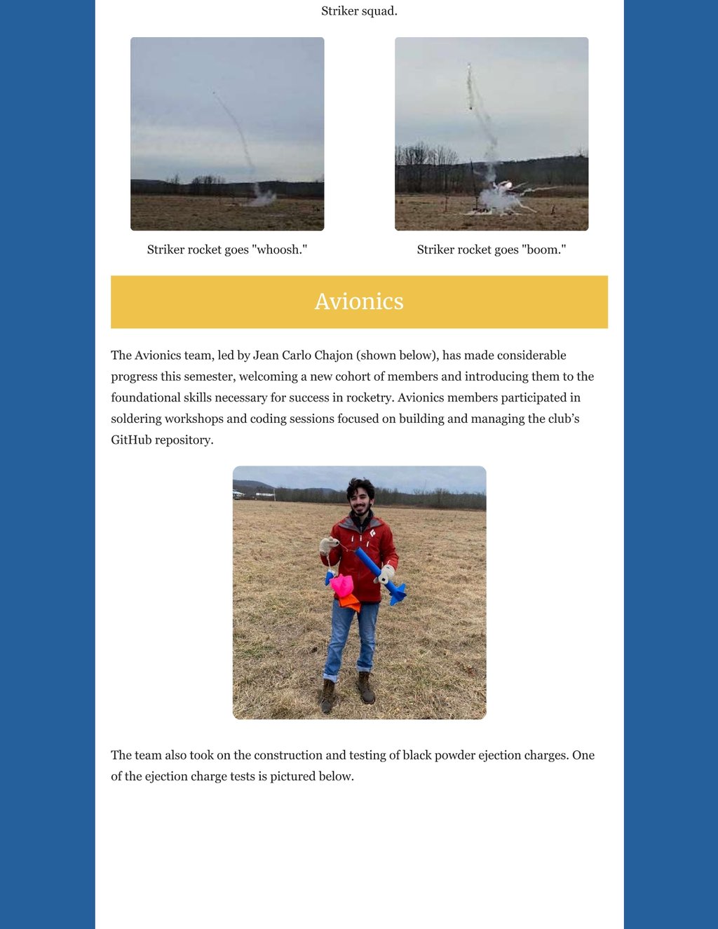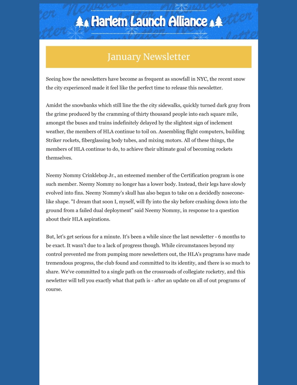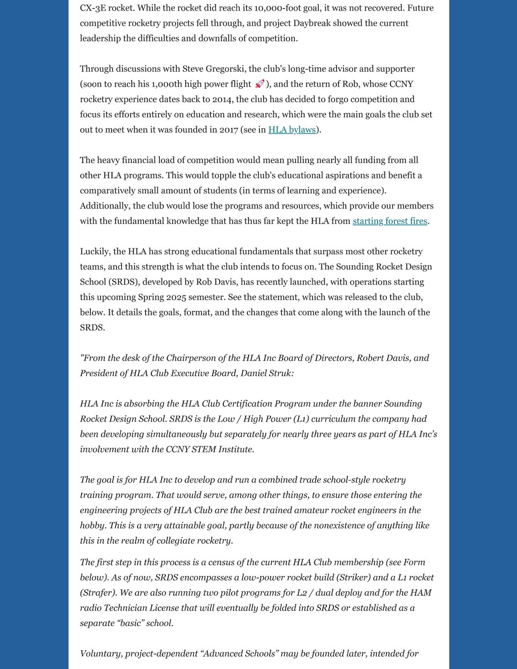 While circumstances beyond my control prevented me from pumping more newsletters out, the HLA's programs have made tremendous progress, the club found and committed to its identity, and there is so much to share. We've committed to a single path on the crossroads of collegiate rocketry, and this newletter will tell you exactly what that path is - after an update on all of out programs of course.