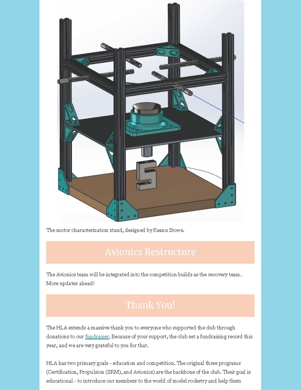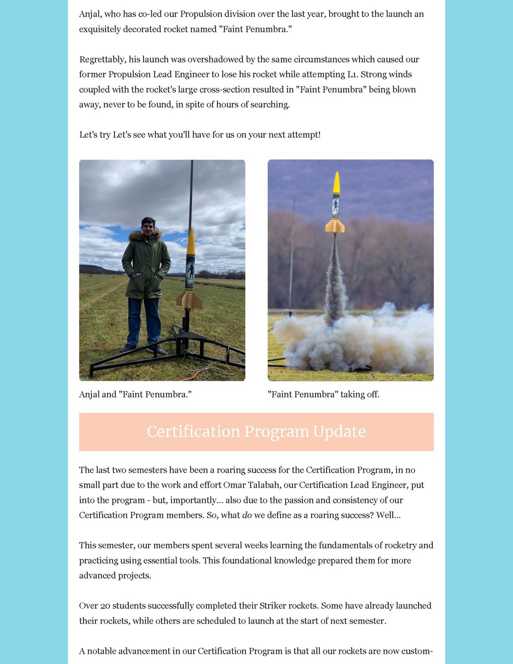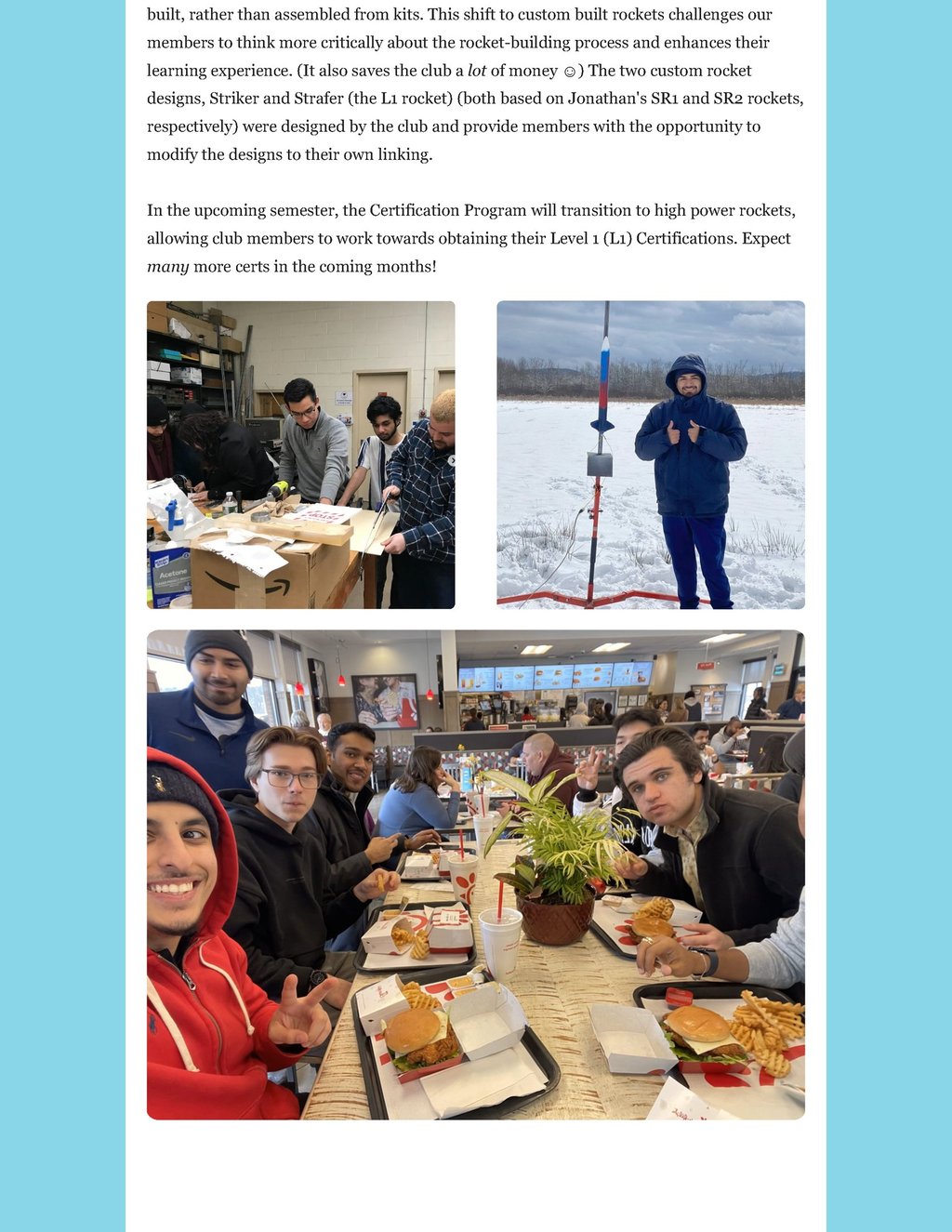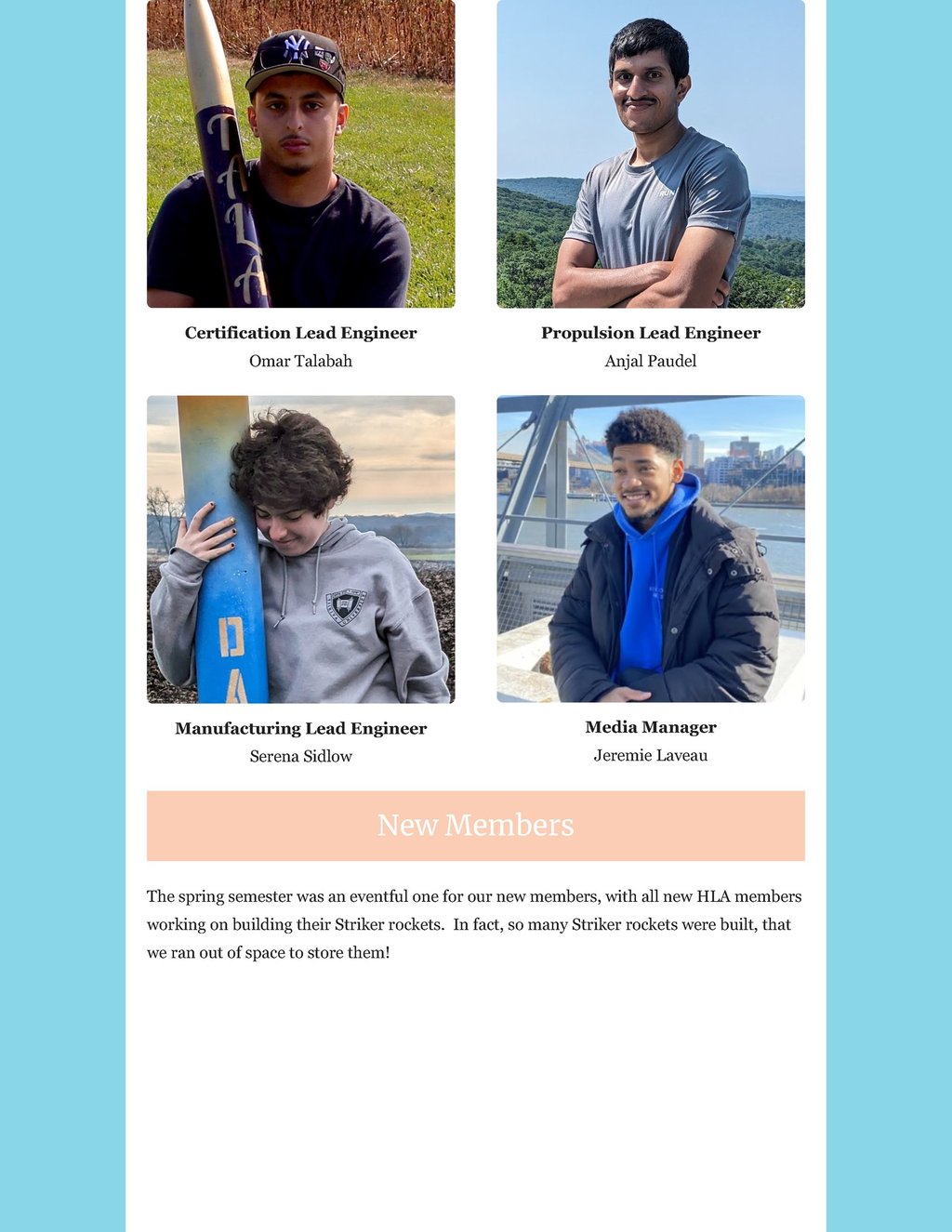 Read about details on our new Lead Engineer roles, catch up on last semester's highlights, take a peek at our new upcoming competitive rocket, and bid adieu to seven graduating club members!