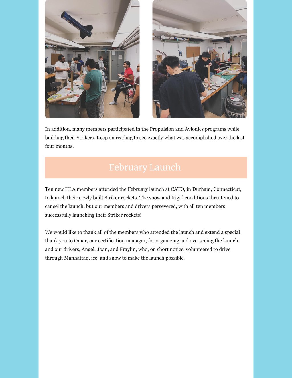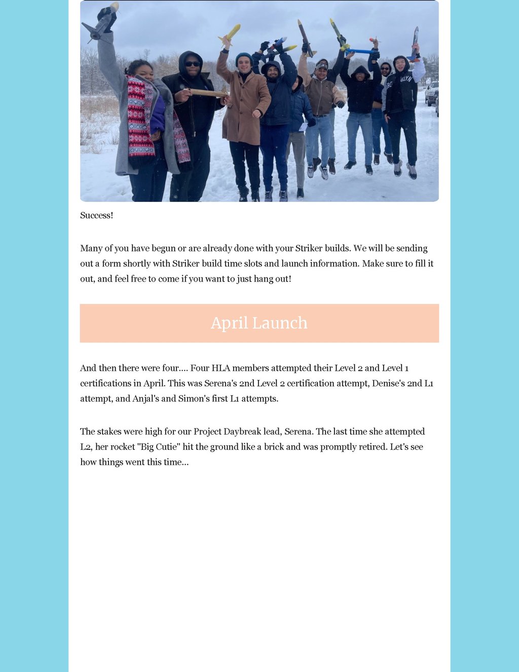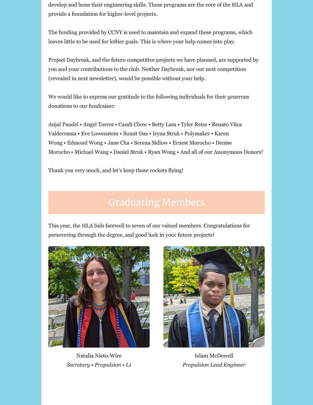 Read about details on our new Lead Engineer roles, catch up on last semester's highlights, take a peek at our new upcoming competitive rocket, and bid adieu to seven graduating club members!