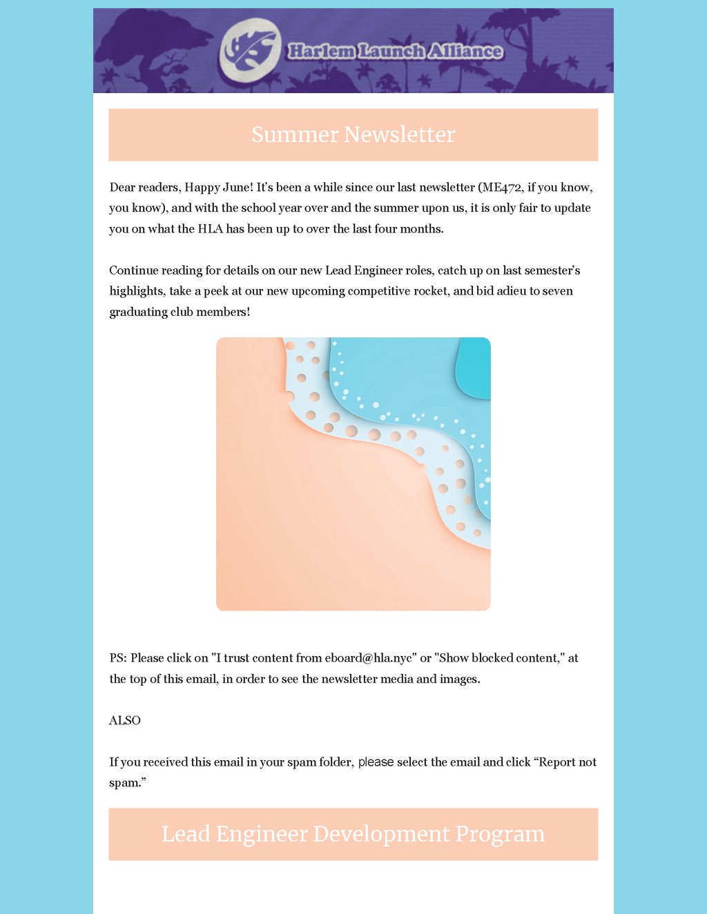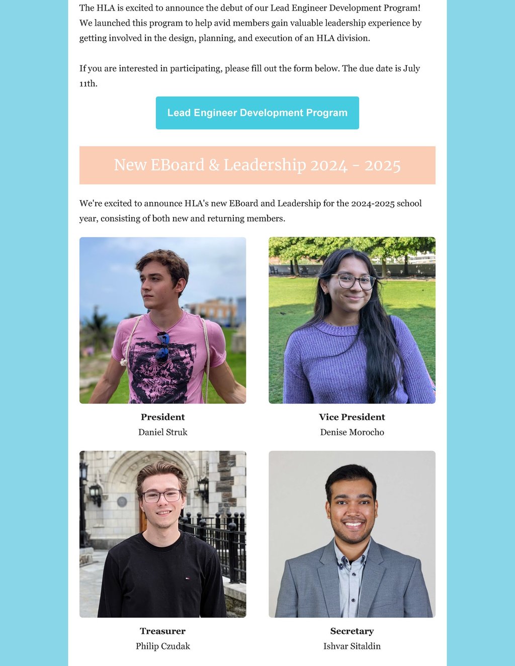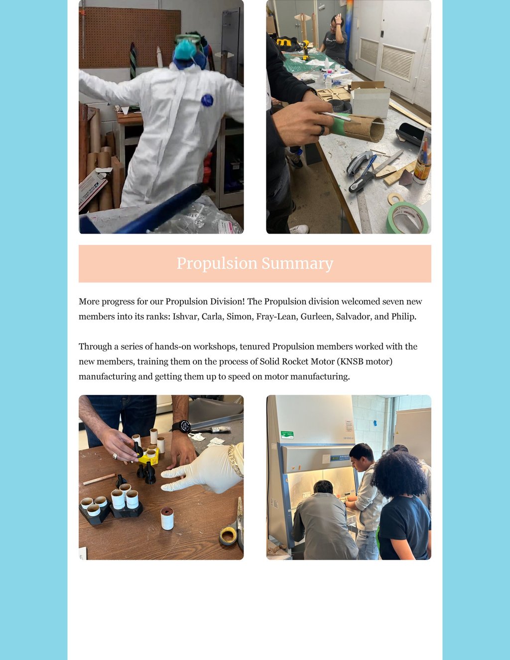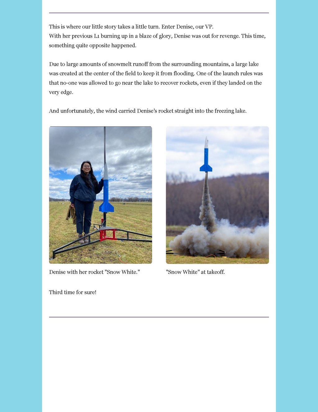 Read about details on our new Lead Engineer roles, catch up on last semester's highlights, take a peek at our new upcoming competitive rocket, and bid adieu to seven graduating club members!